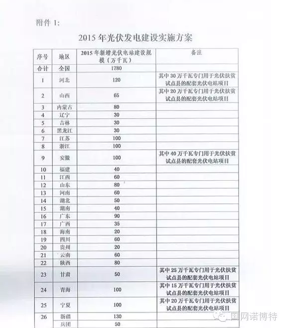 國(guó)家能源局關(guān)于下達(dá)2015年光伏發(fā)電建設(shè)實(shí)施方案的通知
